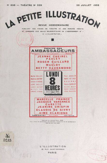 Pièce en trois actes, représentée pour la première fois le 21 avril 1933 au théâtre des Ambassadeurs