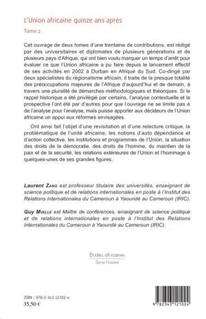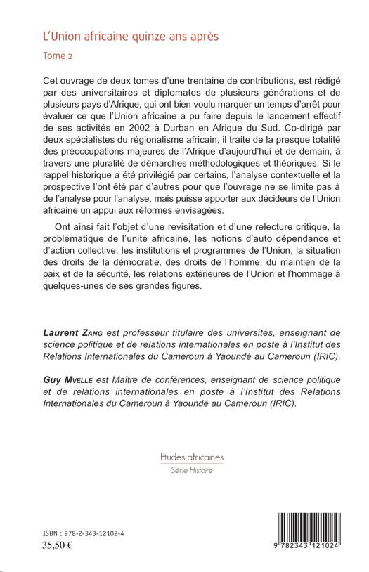 Ces contributions évaluent ce que l'Union africaine a pu faire depuis le lancement effectif de ses activités en 2002. Cet ouvrage en 2 tomes traite de la quasi totalité des préoccupations majeures de l'Afrique d'aujourd'hui et de demain, en apportant rappel historique, analyse contextuelle et prospective. Ont ainsi fait l'objet d'une revisitation et d'une relecture critique, la problématique de l'unité africaine, les institutions et programmes de l'Union, la situation des droits de la démocratie, des droits de l'homme, du maintien de la paix et de la sécurité, les relations extérieures, les notions d'auto indépendance.