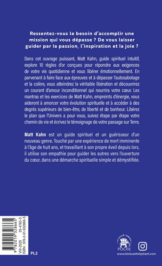 Dans cet ouvrage puissant, Matt Kahn, guide spirituel intuitif, explore 10 règles d’or conçues pour répondre aux exigences de votre vie quotidienne et vous libérer émotionnellement. En parvenant à faire face aux épreuves et à dépasser l’autosabotage et la colère, vous atteindrez la véritable libération et découvrirez un courant d’amour inconditionnel qui nourrira votre coeur. Les mantras et les exercices de Matt Kahn, empreints d’énergie, vous aideront à amorcer votre évolution spirituelle et à accéder à des degrés supérieurs de bien-être, de liberté et de bonheur. Libérez le plan que l’Univers a pour vous, suivez étape par étape votre chemin de vie et écrivez le témoignage de votre passage sur Terre.