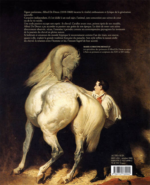 Figure parisienne, Alfred De Dreux (1810-1860) incarne la vitalité enthousiaste et lyrique de la génération nouvelle. Caractère indépendant, il s'est dédié à un seul sujet, l'animal, sans concession aux scènes de cour ou de la vie rurale. Une seule passion occupe son esprit : le cheval. Cavalier avant tout, peintre épris de son modèle, Alfred De Dreux a pu accorder sa passion aux goûts de son époque. Le désir de noter une scène directement observée, vécue, l'entraîne à peindre comme ses contemporains paysagistes les moments de la journée du cheval en pleine nature. Si habitués et amateurs du monde hippique le reconnaissent comme l'un des leurs, son oeuvre, quant à elle, traduit la grande tradition française du panache. Son style reflète la nature réelle du cheval, la relation entre l'homme et lui, l'instant fugitif de leur accord. «MARIE-CHRISTINE RENAULD est spécialiste des peintures d'Alfred De Dreux et expert à Paris en peintures et sculptures des XIXe et XXe siècles.»