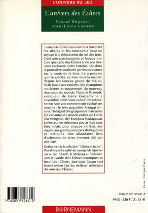 L'univers des Echecs vous invite à traverser les siècles et les continents pour un voyage à la découverte du roi des jeux. C'est une passionnante et longue histoire que celle des Echecs et de son bestiaire enchanté. Cette histoire, née dans la poussière soulevée par les caravanes sur la route de la Soie il y a près de quinze siècles, ce livre vous la raconte depuis les fameux grains de blé du rajah jusqu'aux exploits des champions modernes et notamment du nouveau champion du monde, Vladimir Kramnik, vainqueur de Garry Kasparov le 2 novembre 2000. Sans oublier de retourner en Asie voir comment ont évolué ses cousins : le très populaire Xiangqi chinois, l'intrigant Shogi japonais mais aussi les variantes du monde entier, de l'Inde à la Mongolie, de l'Europe à Madagascar. Le lecteur ne refermera pas ce livre sans être initié, pour chaque variété, aux règles, aux grands principes stratégiques et tactiques. Une abondante liste d'adresses de sites internet clôt cet ouvrage.