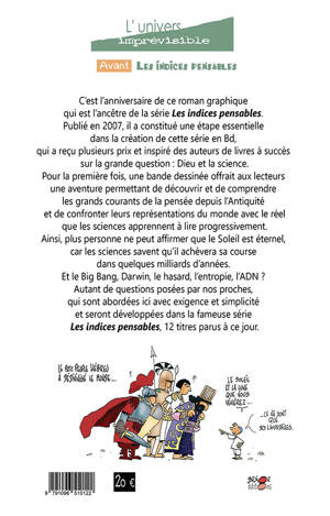 Depuis l'Antiquité, des philosophes ou religieux, dans toutes les civilisations, ont déclaré comment était le monde, et c'est ainsi que sont nés les grands courants de la pensée, avec leurs représentations du monde que personne ne pouvait vérifier pendant des siècles. Mais aujourd'hui, grâce aux progrès de la connaissance, il est devenu possible d'être libéré de fausses croyances, religieuses, philosophiques, ou préscientifiques. Par exemple, on ne peut plus nous raconter que le soleil est éternel. Nous savons qu'il est provisoire. Une seule civilisation osait affirmer cela depuis 3000 ans . Seule contre tous, les sciences de l'expérience lui donnent raison. C'est le point de départ de la grande enquête vérifiable, développée dans la série LES INDICES PENSABLES dont ce roman graphique est l'ancêtre. Poursuivons cette confrontation au réel des grands courants de la pensée pour essayer d'y voir plus clair dans notre Univers et ses étapes de construction progressive.