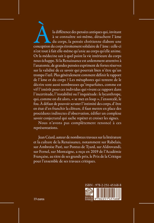 A la difference des pensees antiques qui, invitant a se connaitre soi-meme, detachent l'ame du corps, la pensee chretienne elabore une conception du corps etroitement solidaire de l'ame: celle-ci n'est tout a fait elle-meme qu'unie au corps qu'elle anime. Or la medecine sait a quel point la vie interieure du corps nous echappe. Si la Renaissance est ardemment attentive a l'anatomie, de grandes pensees expriment de fortes reserves sur la validite de ce savoir qui pourrait bien n'etre qu'un trompe-l'oeil. Plus generalement comment definir le rapport de l'ame et du corps ? Les metaphores qui tentent de le decrire sont aussi nombreuses qu'imparfaites, comme est vif l'interet pour ces individus qui vivent ce rapport dans l'incertitude, l'instabilite ou l'inquietude: le lycanthrope, qui, comme on dit alors, se met en loup , l'ensorcele, le fou. A defaut de pouvoir scruter l'intimite des corps, d'etre en etat d'en franchir la cloture, il faut mettre en place des procedures indirectes d'observation, edifier un complexe savoir conjectural qui sache reperer et croiser les signes. Nous n'avons pas completement renonce a ces representations.
