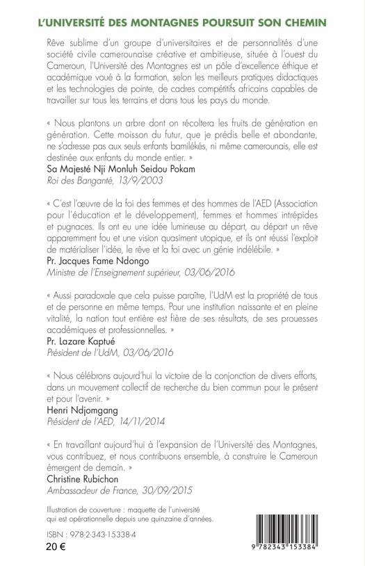 Rêve sublime d'un groupe d'universitaires et de personnalités d'une société civile camerounaise créative et ambitieuse, située à l'ouest du Cameroun, l'Université des Montagnes est un pôle d'excellence éthique et académique. Vouée à la formation, selon les meilleures pratiques didactiques et les technologies de pointe, grâce aux cadres compétitifs africains, elle est capable de travailler sur tous les terrains et dans tous les pays du monde.