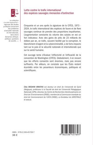 Cinquante et un ans après la signature de la CITES, 1973 - 2024, le trafic international des espèces de faune et de flore sauvages continue de prendre des proportions inquiétantes. L'augmentation constante du volume des saisies en est un fort indicateur. Avec des gains de près de 23 milliards de dollars par an, ce trafic, souvent facilité par la corruption, le blanchiment d'argent et la cybercriminalité, a de forts impacts tant sur la paix et la sécurité nationale et internationale que sur la santé humaine. Cet ouvrage tente d'évaluer l'effectivité et l'efficacité de la convention de Washington (CITES). Globalement, il en ressort que les efforts consentis sont énormes, mais pas encore suffisants. Par ailleurs, on constate que les États restent écartelés entre les pesanteurs économiques, politiques et scientifiques.