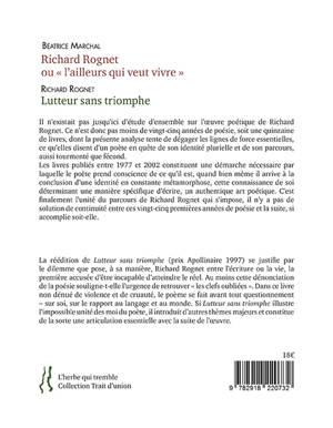 En seconde partie, la réédition de Lutteur sans triomphe (prix Apollinaire 1997) se justifie par le dilemme que pose, à sa manière, Richard Rognet entre l’écriture ou la vie, la première accusée d’être incapable d’atteindre le réel. Au moins cette dénonciation de la poésie souligne-t-elle l’urgence de retrouver « les clefs oubliées ». Dans ce livre non dénué de violence et de cruauté, le poème se fait avant tout questionnement – sur soi, sur le rapport au langage et au monde. Si Lutteur sans triomphe illustre l’impossible unité des moi du poète, il introduit d’autres thèmes majeurs et constitue de la sorte une articulation essentielle avec la suite de l’œuvre.