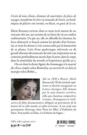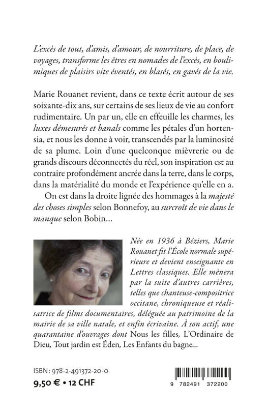 Marie Rouanet revient, dans ce texte écrit autour de ses 70 ans, sur certains de ses lieux de vie au confort rudimentaire. Un par un, elle en effeuille les charmes, les "luxes démesurés et banals" comme les pétales d'un hortensia, et nous les donne à voir transcendés par la luminosité de sa plume. Loin d'une quelconque mièvrerie ou de grands discours déconnectés du réel, son inspiration est au contraire profondément ancrée dans la terre, dans le corps, dans la matérialité du monde et l'expérience qu'elle en a. On est dans la droite lignée des hommages à "la majesté des choses simples" selon Bonnefoy, au "surcroît de vie dans le manque" selon Bobin...