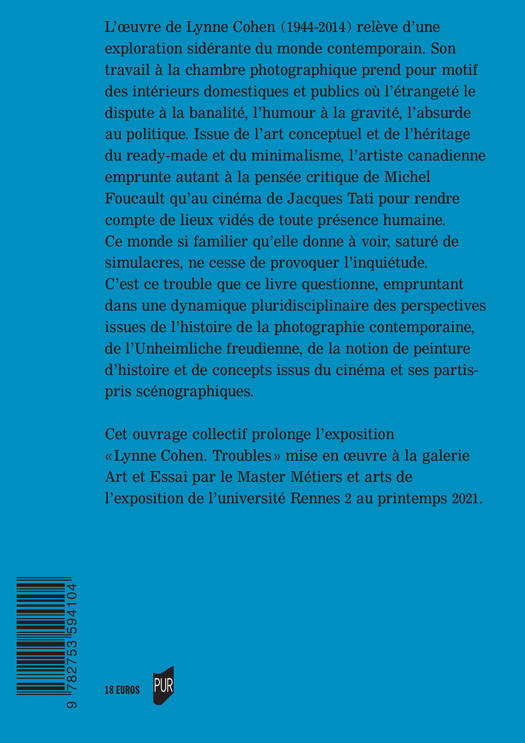 L’oeuvre de Lynne Cohen (1944-2014) relève d’une exploration sidérante du monde contemporain. Son travail à la chambre photographique prend pour motif des intérieurs domestiques et publics où l’étrangeté le dispute à la banalité, l’humour à la gravité, l’absurde au politique. Issue de l’art conceptuel et de l’héritage du ready-made et du minimalisme, l’artiste canadienne emprunte autant à la pensée critique de Michel Foucault qu’au cinéma de Jacques Tati pour rendre compte de lieux vidés de toute présence humaine. Ce monde si familier qu’elle donne à voir, saturé de simulacres, ne cesse de provoquer l’inquiétude. C’est ce trouble que ce livre questionne, empruntant dans une dynamique pluridisciplinaire des perspectives issues de l’histoire de la photographie contemporaine, de l’Unheimliche freudienne, de la notion de peinture d’histoire et de concepts issus du cinéma et ses partis-pris scénographiques.