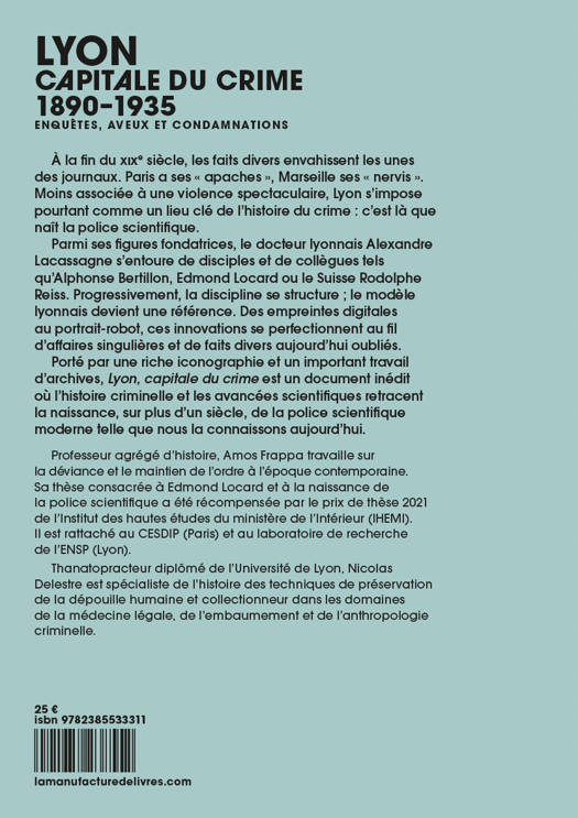 Parmi ses figures fondatrices, le docteur lyonnais Alexandre Lacassagne s’entoure de disciples et collègues tels qu’Alphonse Bertillon, Edmond Locard ou le Suisse Rodophe Reiss. Progressivement, la discipline se structure ; le modèle lyonnais devient une référence. Des empreintes digitales au portrait-robot, ces innovations se perfectionnent au fil d’affaires singulières et de faits-divers aujourd’hui oubliés.