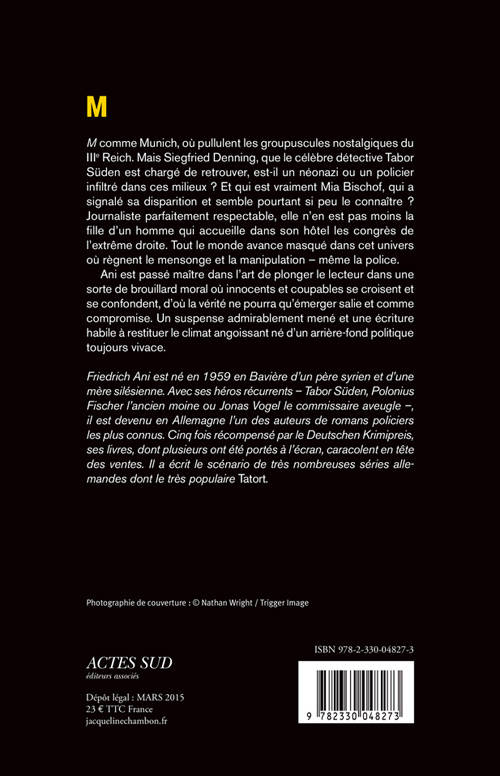 «M» comme Munich, où pullulent les groupuscules nostalgiques du IIIe Reich. Mais Siegfried Denning, que le célèbre détective Tabor Süden est chargé de retrouver, est-il un néonazi ou un policier infiltré dans ces milieux ? Et qui est vraiment Mia Bischof, qui a signalé sa disparition et semble pourtant si peu le connaître ? Journaliste parfaitement respectable, elle n'en est pas moins la fille d'un homme qui accueille dans son hôtel les congrès de l'extrême droite. Tout le monde avance masqué dans cet univers où règnent le mensonge et la manipulation - même la police.