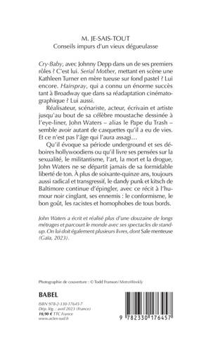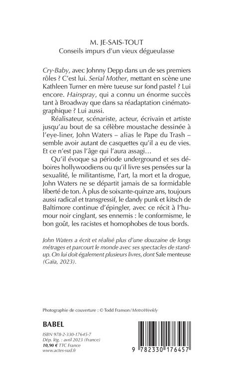"Cry-Baby", avec Johnny Depp dans un de ses premiers rôles ? C'est lui. "Serial Mother", mettant en scène une Kathleen Turner en mère tueuse sur fond pastel ? Lui encore. "Hairspray", qui a connu un énorme succès tant à Broadway que dans sa réadaptation cinématographique ? Lui aussi. Réalisateur, scénariste, acteur, écrivain et artiste jusqu'au bout de sa célèbre moustache dessinée à l'eye-liner, John Waters - alias le Pape du Trash - semble avoir autant de casquettes qu'il a eu de vies. Et ce n'est pas l'âge qui l'aura assagi... Qu'il évoque sa période underground et ses déboires hollywoodiens ou qu'il livre ses pensées sur la sexualité, le militantisme, l'art, la mort et la drogue, John Waters ne se départit jamais de sa formidable liberté de ton. À plus de soixante-quinze ans, toujours aussi radical et transgressif, le dandy punk et kitsch de Baltimore continue d'épingler, avec ce récit à l'humour noir cinglant, ses ennemis : le conformisme, le bon goût, les racistes et homophobes de tous bords.