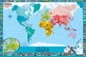 Une carte du monde indiquant les noms de chaque pays et de sa capitale. Avec une page de stickers des différents drapeaux.