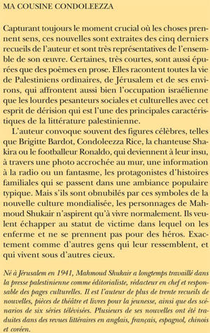 Capturant toujours le moment crucial où les choses prennent sens, ces nouvelles sont extraites des cinq derniers recueils de l'auteur et sont très représentatives de l'ensemble de son oeuvre. Certaines, très courtes, sont aussi épurées que des poèmes en prose. Elles racontent toutes la vie de Palestiniens ordinaires, de Jérusalem et de ses environs, qui affrontent aussi bien l'occupation israélienne que les lourdes pesanteurs sociales et culturelles avec cet esprit de dérision qui est l'une des principales caractéristiques de la littérature palestinienne. L'auteur convoque souvent des figures célèbres, telles que Brigitte Bardot, Condoleezza Rice, la chanteuse Shakira ou le footballeur Ronaldo, qui deviennent à leur insu, à travers une photo accrochée au mur, une information à la radio ou un fantasme, les protagonistes d'histoires familiales qui se passent dans une ambiance populaire typique. Mais s'ils sont obnubilés par ces symboles de la nouvelle culture mondialisée, les personnages de Mahmoud Shukair n'aspirent qu'à vivre normalement. Ils veulent échapper au statut de victime dans lequel on les enferme et ne se prennent pas pour des héros. Exactement comme d'autres gens qui leur ressemblent, et qui vivent sous d'autres cieux. «Né à Jérusalem en 1941, Mahmoud Shukair a longtemps travaillé dans la presse palestinienne comme éditorialiste, rédacteur en chef et responsable des pages culturelles. Il est l'auteur de plus de trente recueils de nouvelles, pièces de théâtre et livres pour la jeunesse, ainsi que des scénarios de six séries télévisées. Plusieurs de ses nouvelles ont été traduites dans des revues littéraires en anglais, français, espagnol, chinois et coréen.»
