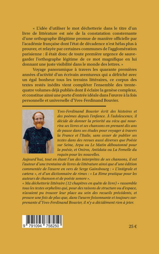 «L’idée d’utiliser le mot déchetterie dans le titre d’un livre de littérature est née de la constatation consternante d’une orthographe illégitime promue de manière officielle par l’académie française dont l’état de décadence n’est hélas plus à prouver, et relayée par certaines communes de l’agglomération parisienne : il était donc de toute première urgence de sauvegarder l’orthographe légitime de ce mot magnifique en lui donnant une juste visibilité dans le monde des lettres.» Voyage panoramique à travers les quarante premières années d’activité d’un écrivain aventureux qui a défriché avec un égal bonheur tous les terrains littéraires, ce corpus des textes restés inédits vient compléter l’ensemble des trente-quatre volumes déjà publiés dont il éclaire la genèse complexe, et constitue ainsi une porte d’entrée idéale dans l’œuvre à la fois personnelle et universelle d’Yves-Ferdinand Bouvier.