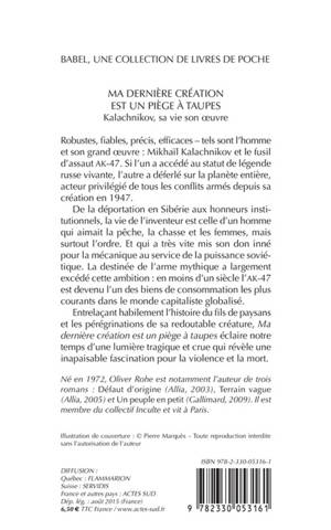 Entrelaçant habilement l'histoire du fils de paysans et les pérégrinations de sa redoutable créature, «Ma dernière création est un piège à taupes »éclaire notre temps d'une lumière tragique et crue qui révèle une inapaisable fascination pour la violence et la mort.