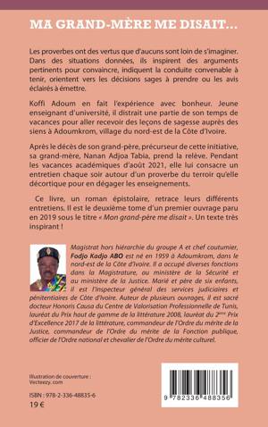 Les proverbes ont des vertus que d'aucuns sont loin de s'imaginer. Dans des situations données, ils inspirent des arguments pertinents pour convaincre, indiquent la conduite convenable à tenir, orientent vers les décisions sages à prendre ou les avis éclairés à émettre. Koffi Adoum en fait l'expérience avec bonheur. Jeune enseignant d'université, il distrait une partie de son temps de vacances pour aller recevoir des leçons de sagesse auprès des siens à Adoumkrom, village du nord-est de la Côte d'Ivoire. Après le décès de son grand-père, précurseur de cette initiative, sa grand-mère, Nanan Adjoa Tabia, prend la relève. Pendant les vacances académiques d'août 2021, elle lui consacre un entretien chaque soir autour d'un proverbe du terroir qu'elle décortique pour en dégager les enseignements. Ce livre, un roman épistolaire, retrace leurs différents entretiens. Il est le deuxième tome d'un premier ouvrage paru en 2019 sous le titre Mon grand-père me disait... . Un texte très inspirant !
