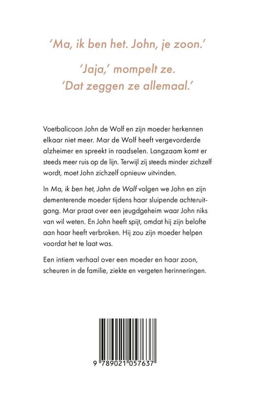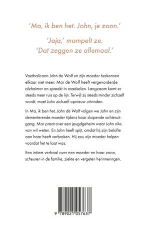 ‘Ze herkent me niet meer, maar weet ik zelf nog wel wie ze was?’ John de Wolf heeft spijt, omdat hij zijn belofte aan zijn dementerende moeder heeft gebroken. Hij zou haar helpen voordat het te laat was. Nu zit ze in een verzorgingstehuis en zijn alle herinneringen uit haar geheugen gewist.In Ma, ik ben het, John de Wolf volgen we John en zijn moeder tijdens haar aftakelingsproces. Een intiem portret over ziekte, mantelzorg, familie, het verleden en de juiste beslissing nemen als je niks meer kan vragen.