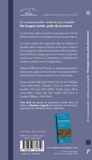 Édition bilingue, traduction du komi et du russe par Yves Avril et Sébastien Cagnoli Ces poètes puisent leur inspiration dans les traditions et légendes, dans la nature et l’histoire de leur pays: l’enfance à la campagne, la vaillante femme komie, la forêt boréale au pied de l’Oural, la langue qui n’a rien de slave, les glorieux ancêtres qui résistèrent au christianisme et défendirent les traditions animistes avant l’évangélisation… Malgré les difficultés de l’histoire, on retiendra la persistance d’émouvants appels au réveil, à l’espoir : les Komis n’oublient jamais la fierté et l’amour pour leur terre et leur culture.