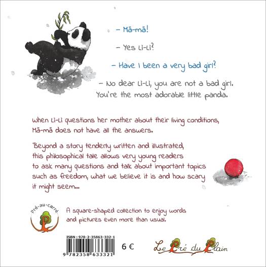 Traduction en anglais de "Dis Ma-ma..." par son autrice : Corinne Laven. Dans la collection Pré-au-carré : une collection carrée pour savourer encore plus de mots et d’images qu’à l’accoutumée. « —Dis Ma-ma ! — Oui Li-Li ? — Est-ce que j’ai fait une grosse bêtise ? — Non ma Li-Li, tu n’as pas fait de bêtise. Tu es la plus adorable des petits pandas. » Quand Li-Li interroge sa mère sur leurs conditions de vie, Ma-ma ne peut pas répondre à tout. - Au-delà d’une histoire tendrement écrite et illustrée, ce conte philosophique permet, dès l’âge tendre, de poser de nombreuses questions et d’échanger sur des sujets aussi importants que la liberté, ce qui est ou que l’on croit... – Album à lire et se faire lire de 4 à 104 ans Pré-au-carré : A square-shaped collection to enjoy words and pictures even more than usual. "— Mā-mā! — Yes Lì-Lì? — Have I been a very bad girl? — No dear Lì-Lì, you are not a bad girl. You’re the most adorable little panda". When Lì-Lì questions her mother about their living conditions, Mā-mā does not have all the answers. Beyond a story tenderly written and illustrated, this philosophical tale allows very young readers to ask many questions and talk about important topics such as freedom , what we believe it is and how scary it might seem...– From 4 to 104.