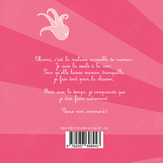 "Chromi, c’est la maladie invisible de maman. Je suis la seule à la voir. Pour qu’elle laisse maman tranquille, je fais tout pour la chasser. Mais avevec le temps, je comprends que je dois faire autrement. Viens voir comment !"<br /><br /> En France 40% de la population déclare vivre avec au moins une maladie ou un problème de santé chronique et 80% de ces maladies sont invisibles.<br /><br /> Si certaines de ces maladies posent peu de problèmes dans la vie quotidienne, d'autres sont particulièrement invalidantes et demandent une adaptation permanente. C’est le cas, par exemple, de l'endométriose, de la dépression, de la maladie de crohn, des fibromyalgies, des migraines, des troubles borderline, de la sclérose en plaques, etc.<br /><br /> Et les enfants sont, bien souvent, les premiers témoins des effets de la maladie sur leur(s) parent(s). <br /> Ce livre (accessible dès 3 ans) est un support de médiation positif pour que parents et enfants puissent cheminer ensemble et échanger autour de la maladie. Il offre des outils et des clés de discussion précis et bienveillants afin de sécuriser les enfants autour de situations qui peuvent être inquiétantes pour eux.<br /><br /> Mettre l’invisible en mots et en images permet à l'enfant, dès le plus jeune âge, de briser le tabou de la maladie.