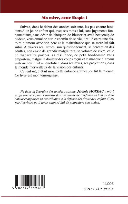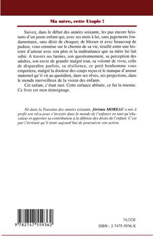 Suivez, dans le début des années soixante, les pas encore hésitants d'un jeune enfant qui, avec ses mots à lui, vous emmène sur le chemin de sa vie, tiraillé entre une histoire d'amour avec son père et la maltraitance que sa mère lui fait subir. A travers ses larmes, sa perception des adultes, sa volonté de vivre, ce petit bonhomme vous emportera, malgré la douleur des coups reçus, le manque d'amour, dans le monde merveilleux de la vision des enfants. Cet enfant, c'était moi. Cette enfance abîmée, ce fut la mienne. Ce livre est un témoignage.