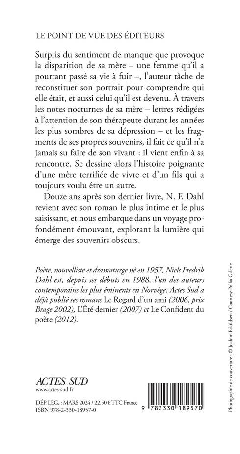 Surpris par le sentiment de manque que provoque la disparition de sa mère - une femme qu'il a pourtant passé sa vie à fuir -, l'auteur tâche de reconstituer son portrait pour comprendre qui elle était, mais aussi celui qu'il est devenu. À travers les notes nocturnes de sa mère et les fragments de ses propres souvenirs, il fait ce qu'il n'a pas su faire de son vivant : il vient enfin à sa rencontre. Se dessine l'histoire poignante d'une mère terrifiée de vivre et d'un fils qui a toujours voulu être un autre.