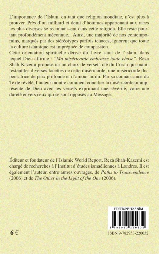 L'importance de l'Islam, en tant que religion mondiale, n'est plus à prouver. Près d'un milliard et demi d'hommes appartenant aux races les plus diverses se reconnaissent dans cette religion. Elle reste pourtant profondément méconnue... Ainsi, une majorité de nos contemporains, marqués par des stéréotypes parfois tenaces, ignorent que toute la culture islamique est imprégnée de compassion. Cette orientation spirituelle dérive du Livre saint de l'Islam, dans lequel Dieu affirme : "Ma miséricorde embrasse toute chose". Reza Shah-Kazemi propose ici un choix de versets-clé du Coran qui manifestent les diverses facettes de cette miséricorde, une miséricorde dispensatrice de paix profonde et d'amour infini. Par sa connaissance du Texte révélé, l'auteur montre comment concilier la miséricorde omniprésente de Dieu avec les versets exprimant une sévérité, voire une dureté envers ceux qui se sont opposés au Message.