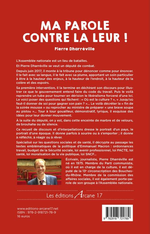 Depuis juin 2017, Pierre Dharréville monte à la tribune pour dénoncer comme pour énoncer. Il le fait avec sa langue, il le fait avec sa plume, apportant un soin particulier à être à la hauteur des enjeux, à la hauteur de l'endroit, à la hauteur de la colère et des espoirs. A la suite du député de Martigues (13), on y est, dans cette enceinte de marbre et de velours, de brouhaha ou de silence. Ce recueil de discours et d'interpellations dresse le portrait d'un pays, le portrait d'une époque. Il donne parfois à sourire ou à s'emporter ; il donne à réfléchir, à réagir ou à rêver. Écrivain, journaliste, Pierre Dharréville est né en 1975. Membre du Parti communiste, où il est en charge de la culture, il est porte parole de son groupe à l'Assemblée nationale