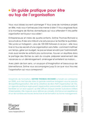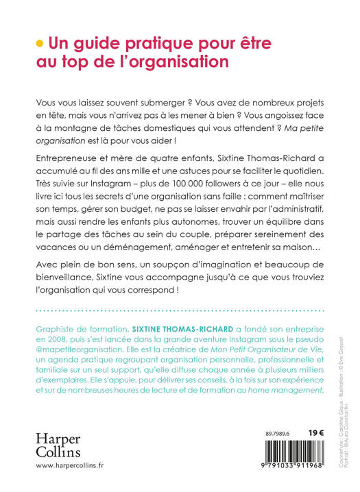 À propos de l’autriceGraphiste de formation, Sixtine Thomas-Richard a fondé son entreprise en 2008, puis s’est lancée dans la grande aventure Instagram sous le pseudo @mapetiteorganisation. Elle est la créatrice de Mon Petit Organisateur de Vie, un agenda pratique regroupant organisation personnelle, professionnelle et familiale sur un seul support, qu’elle diffuse chaque année à plusieurs milliers d’exemplaires. Elle s’appuie, pour délivrer ses conseils, à la fois sur son expérience et sur de nombreuses heures de lecture et de formation au home management.