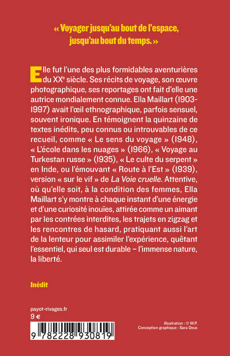 Elle fut l'une des plus formidables aventurières du XXe siècle. Ses récits de voyage, son oeuvre photographique, ses reportages ont fait d'elle une autrice mondialement connue. Ella Maillart (1903-1997) avait l'oeil ethnographique, parfois sensuel, souvent ironique. En témoignent la quinzaine de textes inédits, peu connus ou introuvables de ce recueil, comme "Le sens du voyage" (1948), "L'école dans les nuages" (1966), "Voyage au Turkestan russe" (1935), "Le culte du serpent" en Inde, ou l'émouvant "Route à l'Est" (1939), version "sur le vif" de "La Voie cruelle". Attentive, où qu'elle soit, à la condition des femmes, Ella Maillart s'y montre à chaque instant d'une énergie et d'une curiosité inouïes, attirée comme un aimant par les contrées interdites, les trajets en zig- zag et les rencontres de hasard, pratiquant aussi l'art de la lenteur pour assimiler l'expérience, quêtant l'essentiel, qui seul est durable - l'immense nature, la liberté.