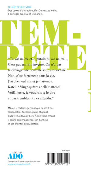 Les confidences rêvées d'un futur père à son enfant. Zacharie n'a que dix-neuf ans et n'a pas fini ses études. Il exprime pourtant sans détour son désir de paternité. Il remonte le fil de l'histoire, celle de sa rencontre avec Katell, leur relation, jusqu'à l'attente du test de grossesse. Il dit le poids du rôle qu'il s'apprête à endosser et sa fierté lors de l'annonce de la nouvelle à ses parents, à ses proches. Un texte qui mêle tendresse et détermination pour évoquer un thème inédit en littérature jeunesse.
