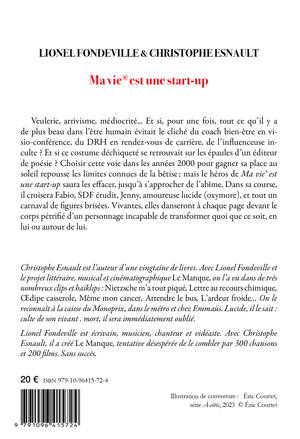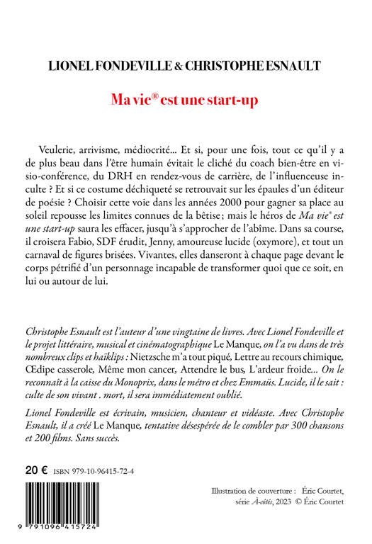 À longueur de journée, le directeur des éditionstypographiques Potlatch est bombardé de propositions de textes. Il raconte dansMa vie® est une start-up comment, pour figurer au catalogue Potlatch, certainspoètes perdent toute dignité, comment ces mini-Rastignac sans boussole achètentsans ciller des packs de services gazeux proposés par Potlatch : correction (ensous-traitance), réécriture complète (en sous-sous traitance), publicité moisiesur des blogs littéraires obscurs... Bref, mille et une combines pour dépouillerles affamés de publication. Et ça marche ! Depuis sa place de TGV en premièreclasse, le Potlatch gourou gagne quatre SMIC entre Paris et Toulouse, en touteélégance. Mais cet immoraliste mou veut davantage. Il veut lesuccès, la "glouare", l'Histoire avec une grande hache. Pour cela, il vaexploiter la vie et les dits de Fabio, "son" SDF érudit, et la visionpanoramique d'une amoureuse lucide, Jenny. Une immersion dans larue auprès des sans-abris (un orteil seulement) lui permet bientôt d'écrire lebest-seller postmoderne ultime : l'histoire d'un éditeur escroc, philanthropepar opportunisme, avec autocollants pour sauver le monde et suggestions depancartes cool pour mendiants. Trois rires garantis à chaque page. Son titre :Ma vie® est une start-up. Car cet éditeur caresse le rêve de chaque éditeur :devenir l'auteur goncourtisé d'un chef-d'oeuvre de la littérature française,avec le soutien des meilleurs partenariats culturels européens. Quand on réside dans un loft de 200 m2, le malheur des pauvres est un excellentsujet de comédie. Mais aveugle à sa propre tragédie, le narrateur de Ma vie® estune start-up ignore qu'il court vers le néant.