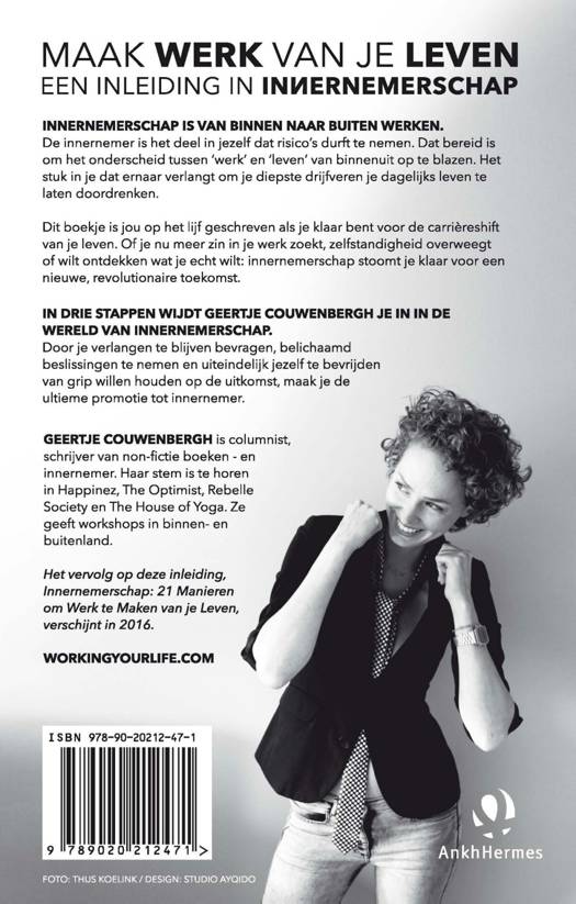 In drie stappen wijdt Geertje Couwenbergh je in Maak werk van je leven, een inleiding in innernemerschap in in de wereld van innernemerschap. Wat is een innernemer? De innernemer is het deel in jezelf dat risico's durft te nemen. Dat bereid is om het onderscheid tussen 'werk' en 'leven' van binnenuit op te blazen. Het stuk in je dat ernaar verlangt om je diepste drijfveren je dagelijks leven te laten doordrenken. Dit boekje is je op het lijf geschreven als je klaar bent voor de carrièreshift van je leven. Of je nu meer zin in je werk zoekt, zelfstandigheid overweegt of wilt ontdekken wat je echt wilt: innernemerschap stoomt je klaar voor een nieuwe, revolutionaire toekomst! Door je verlangen te blijven bevragen, belichaamd beslissingen te nemen en uiteindelijk jezelf te bevrijden van grip willen houden op de toekomst, maak je de ultieme promotie tot innernemer.