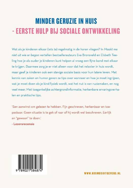 In 'Maakt me niet uit wie er begon!' vertellen bestsellerauteurs Eva Bronsveld ('Temperamentvolle kinderen') en Elsbeth Teeling ('Relax mama!') ouders hoe ze kinderen – broers, zussen en vriendjes – kunnen helpen al vroeg een goede band met elkaar te krijgen. Daarmee geef je kinderen een stevige sociale basis. Met kennis van zaken en humor geven ze tips over wanneer en hoe je moet ingrijpen, wat je moet doen als je kind fysiek wordt, wat het nut is van ruziemaken en nog veel meer. Met toegankelijke achtergrondinformatie, herkenbare ervaringsverhalen en praktische tips. Zo wordt het gezelliger in huis!