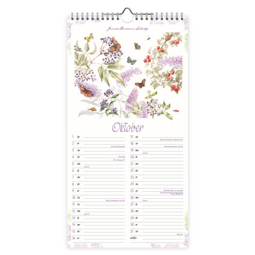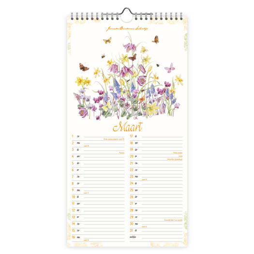 Deze stijlvolle maandnotitiekalender van Janneke Brinkman-Salentijn is inclusief alle Nederlandse en Belgische feest- en vakantiedagen. De kalender geeft een overzichtelijke planning voor de hele maand. Deze kalender staat vol met tekeningen van Janneke Brinkman. Al meer dan 25 jaar maakt zij iedere maand een nieuwe aquarel van bloemen die haar op dat moment inspireren.