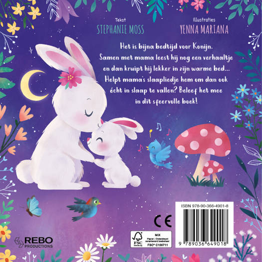 Het is bijna bedtijd voor Konijn. Samen met mama leest hij nog een verhaaltje en dan kruipt hij lekker in zijn warme bed… Helpt mama's slaapliedje hem om dan ook écht in slaap te vallen? Beleef het mee in dit sfeervolle boek!