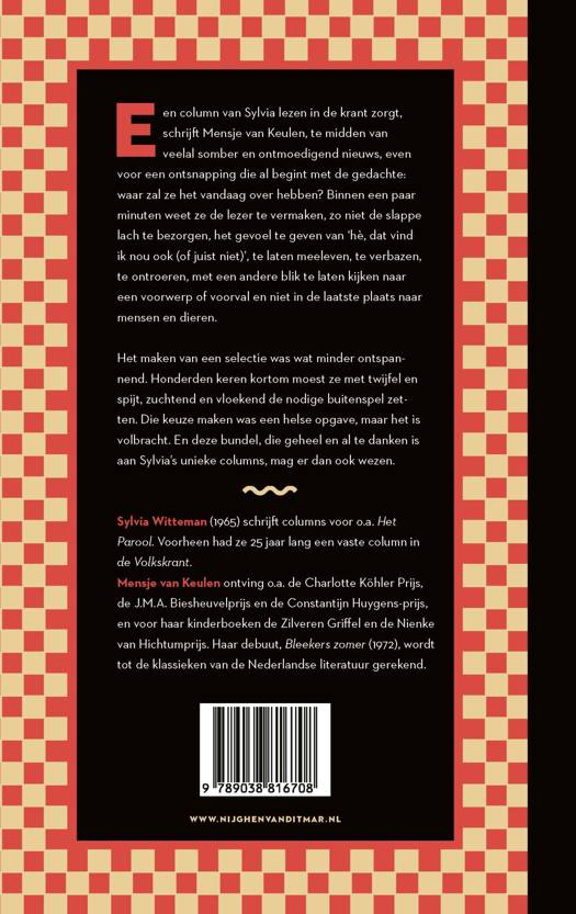 Een column van Sylvia lezen in de krant zorgt, schrijft Mensje van Keulen, te midden van veelal somber en ontmoedigend nieuws, even voor een ontsnapping die al begint met de gedachte: waar zal ze het vandaag over hebben? Binnen een paar minuten weet ze de lezer te vermaken, zo niet de slappe lach te bezorgen, het gevoel te geven van ‘hè, dat vind ik nou ook (of juist niet)’, te laten meeleven, te verbazen, te ontroeren, met een andere blik te laten kijken naar een voorwerp of voorval en niet in de laatste plaats naar mensen en dieren.