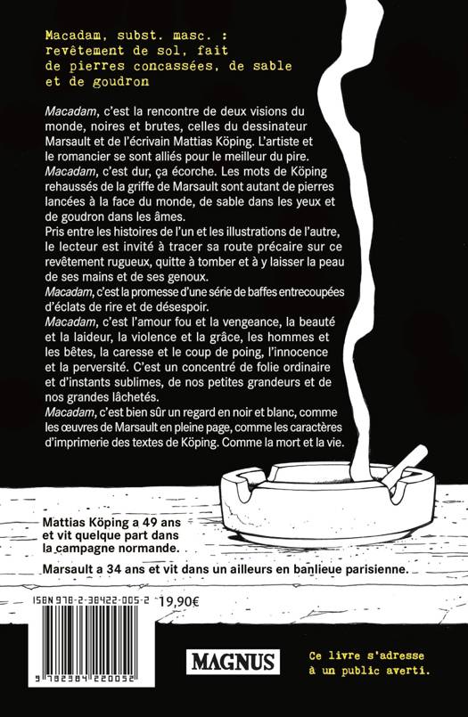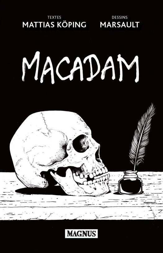 Macadam, c'est la rencontre de deux visions du monde, noires et brutes, celles du dessinateur Marsault et de l'écrivain Mattias Koping. L'artiste et le romancier se sont alliés pour le meilleur du pire.