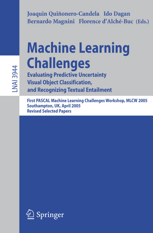 This book constitutes the refereed post-proceedings of the First PASCAL Machine Learning Challenges Workshop, MLCW 2005. 25 papers address three challenges: finding an assessment base on the uncertainty of predictions using classical statistics, Bayesian inference, and statistical learning theory; second, recognizing objects from a number of visual object classes in realistic scenes; third, recognizing textual entailment addresses semantic analysis of language to form a generic framework for applied semantic inference in text understanding.