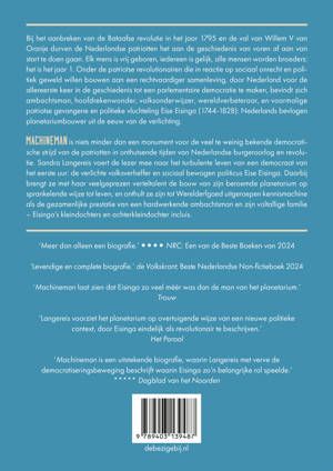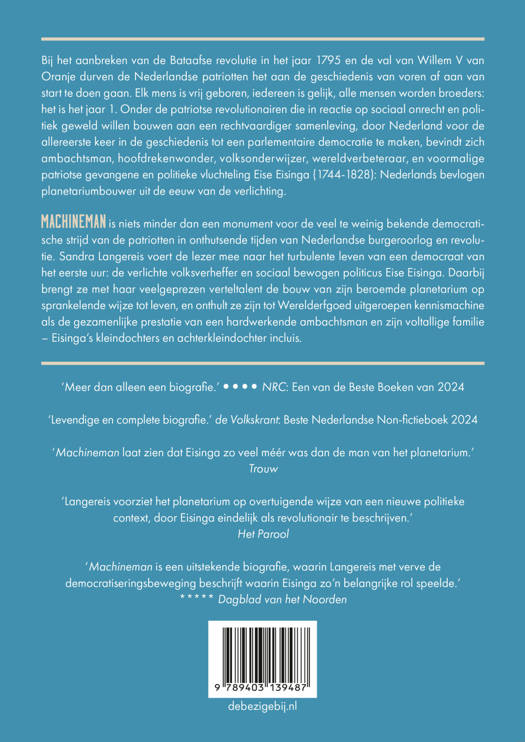 Machineman volgt het veelbewogen leven en werk van de gepassioneerde heelalonderzoeker, verlichte volksverheffer en revolutionaire politicus Eise Eisinga in tijden van burgeroorlog en revolutie op de voet. In deze rijke biografie onthult Sandra Langereis de geschiedenis van zijn wereldberoemd geworden Planetarium als monument voor een hardwerkende ambachtsman en zijn familie.