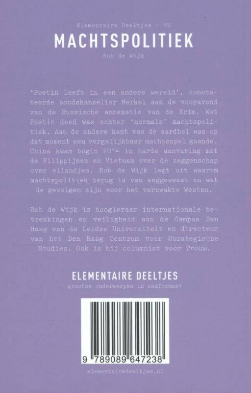 Negentiende-eeuws gedrag in de eenentwintigste eeuw, zo noemde de Amerikaanse minister van Buitenlandse Zaken John Kerry de inval van Rusland op de Krim. Legers worden nog steeds gebruikt om gebieden te veroveren. Tot voor kort werd de wereld geconfronteerd met westerse machtspolitiek. Nu doen ook opkomende landen aan landjepik. Zo kwam China recent met buren in conflict over grondstofrijke zeegebieden. In dit Elementaire Deeltje maakt Rob de Wijk duidelijk dat machtspolitiek een essentieel onderdeel is van internationale betrekkingen.