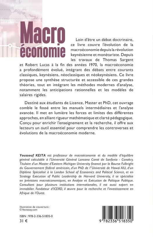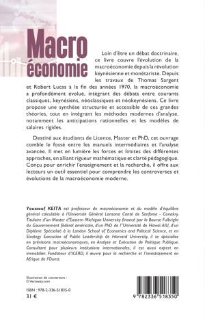 Loin d'être un débat doctrinaire, ce livre couvre l'évolution de la macroéconomie depuis la révolution keynésienne et monétariste. Depuis les travaux de Thomas Sargent et Robert Lucas à la fin des années 1970, la macroéconomie a profondément évolué, intégrant des débats entre courants classiques, keynésiens, néoclassiques et néokeynésiens. Ce livre propose une synthèse structurée et accessible de ces grandes théories, tout en intégrant les méthodes modernes d'analyse, notamment les anticipations rationnelles et les modèles de salaires rigides. Destiné aux étudiants de Licence, Master et PhD, cet ouvrage comble le fossé entre les manuels intermédiaires et l'analyse avancée. Il met en lumière les forces et limites des différentes approches, en alliant rigueur mathématique et clarté pédagogique. Conçu pour enrichir l'enseignement et la recherche, il offre aux lecteurs un outil essentiel pour comprendre les controverses et évolutions de la macroéconomie moderne.