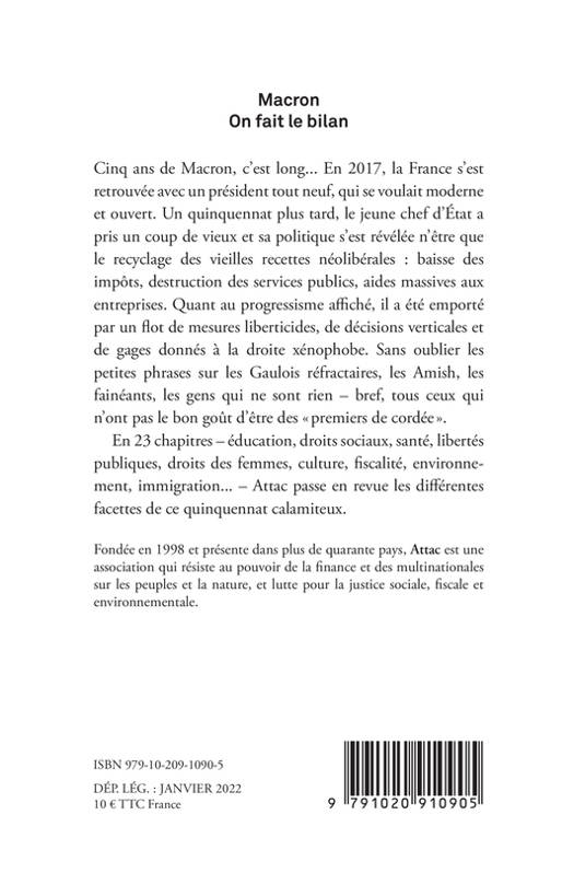 Après un premier point d'étape en forme d'alerte, « L'imposture Macron » (Attac/Fondation Copernic) qui a connu un joli succès de librairie, Attac dresse un bilan d'ensemble du quinquennat qui se termine. Cet ouvrage court et synthétique articulé autour d'une vingtaine de thématiques livre faits et analyses sur la présidence d'Emmanuel Macron. Suivant la chronologie du quinquennat et ponctué par les phrases marquantes énoncées par le président ainsi que les réformes entreprises, ce livre déroule de manière implacable les enseignements tirés des cinq dernières années dans un moment crucial pour l'avenir de la France.