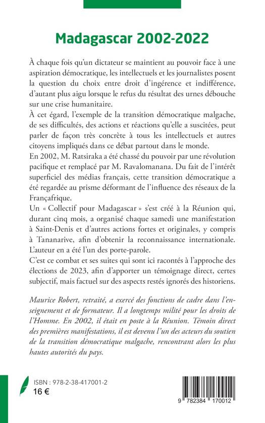 Un « Collectif pour Madagascar » s’est créé à la Réunion qui, durant cinq mois, a organisé chaque samedi une manifestation à Saint-Denis et d’autres actions fortes et originales, y compris à Tananarive, afin d’obtenir la reconnaissance internationale. L’auteur en a été l’un des porte-parole. C’est ce combat et ses suites qui sont ici racontés à l’approche des élections de 2023, afin d’apporter un témoignage direct, certes subjectif, mais factuel sur des aspects restés ignorés des historiens.