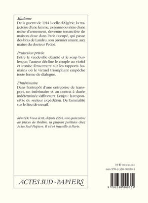 «Rémi De Vos a écrit, depuis 1994, une quinzaine de pièces de théâtre, la plupart publiées chez Actes Sud-Papiers. Il vit et travaille à Paris.»
