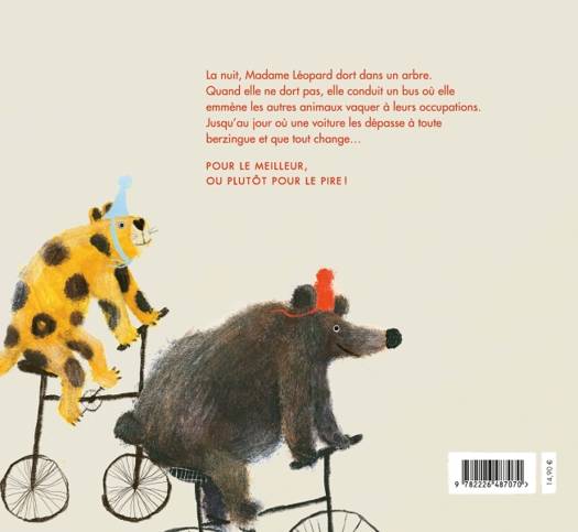 La nuit, Madame Léopard dort dans un arbre. Quand elle ne dort pas, elle conduit un bus où elle emmène les autres animaux vaquer à leurs occupations. Jusqu'au jour où une voiture les dépasse à toute berzingue et que tout change... Pour le meilleur, ou plutôt pour le pire !