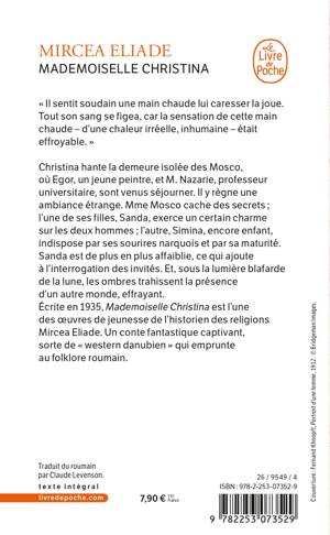 Écrite en 1935, Mademoiselle Christina est l’une des œuvres de jeunesse de l’historien des religions Mircea Eliade. Elle emprunte à dessein au folklore roumain et amorce la veine fantastique de l’auteur.