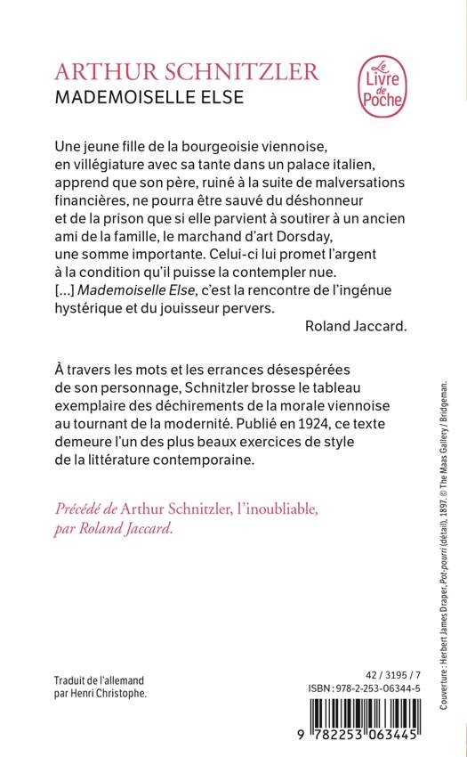 Mademoiselle Else ou le soliloque tragique d’une femme piégée par les oscillations de l’âme. A travers les mots et les errances désespérées de son personnage, Schnitzler brosse le tableau exemplaire des fascinants déchirements de la morale viennoise au tournant de la modernité, valse – hésitation entre désir et devoir, entre fantasmes de prostitution et rêves de continence. Publié en 1924, ce texte demeure l’un des plus beaux exercices de style de la littérature contemporaine.Précédé de Arthur Schnitzler, l’inoubliable, par Roland Jaccard.
