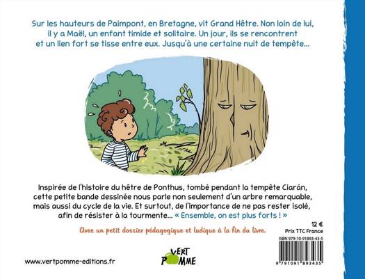 Sur les hauteurs de Paimpont, en Bretagne, vit Grand Hêtre. Non loin de lui, il y a Maël, un enfant timide et solitaire. Un jour, ils se rencontrent et un lien fort se tisse entre eux. Jusqu'à une certaine nuit de tempête... Inspirée de l'histoire du hêtre de Ponthus, tombé pendant la tempête Ciarán, cette petite bande dessinée nous parle non seulement d'un arbre remarquable, mais aussi du cycle de la vie. Et surtout, de l'importance de ne pas rester isolé, afin de résister à la tourmente... « Ensemble, on est plus forts ! » Avec un petit dossier pédagogique et ludique à la fin du livre.