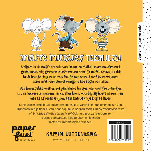 Karin Luttenberg liet al duizenden mensen ervaren hoe leuk tekenen kan zijn. Misschien ken je haar al van haar populaire boeken zoals Handlettering doe je zo! of Schattige diertjes teken je zo! Ook nu daagt ze je uit om een potlood te pakken, mee te doen en je eigen maffe muizenwereld te tekenen!